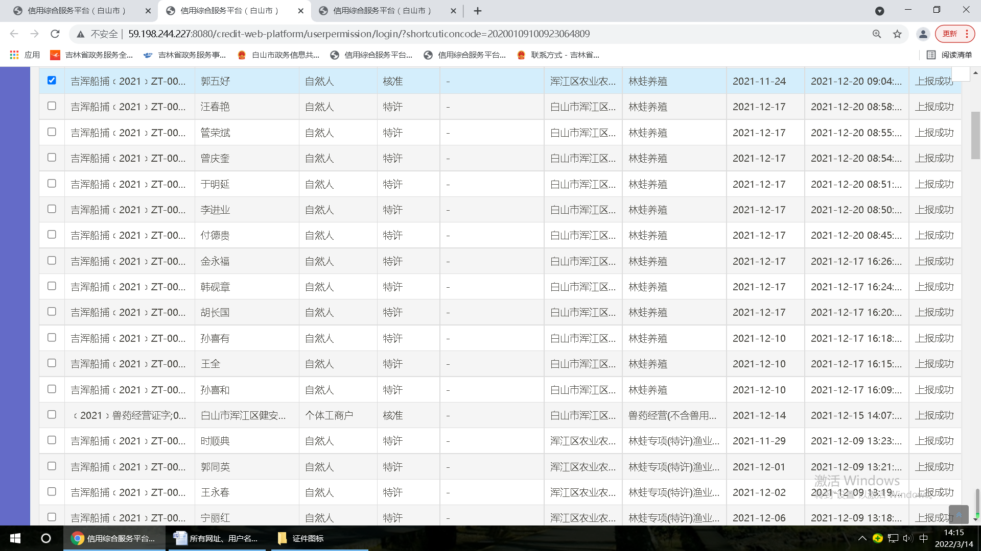 2021年信用综合服务平台浑江区农业农村局行政许可公示目录