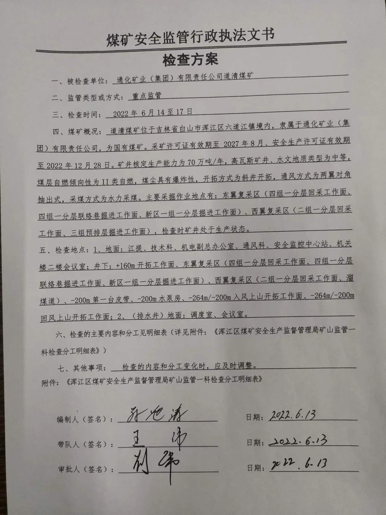 2022年6月道清煤矿计划监管执法检查方案