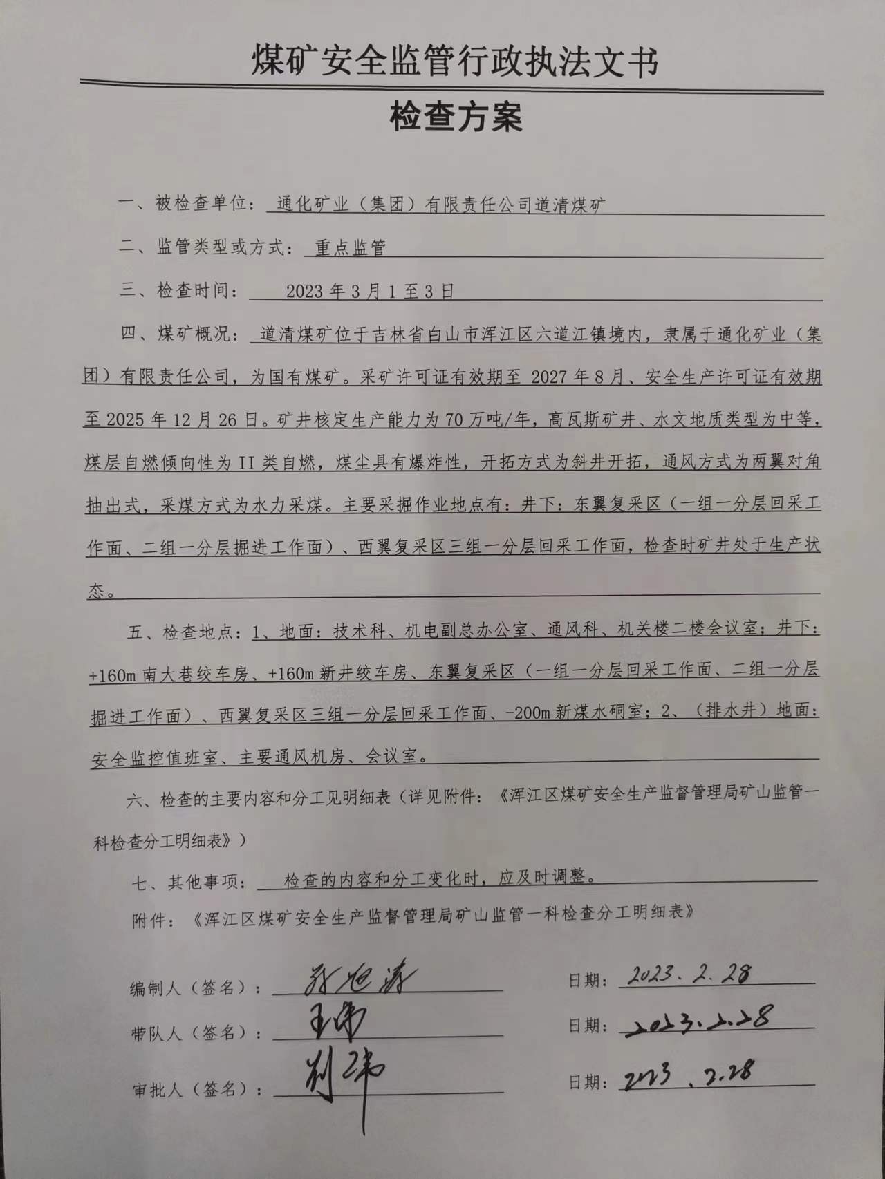 2023年3月道清煤矿计划监管执法检查方案