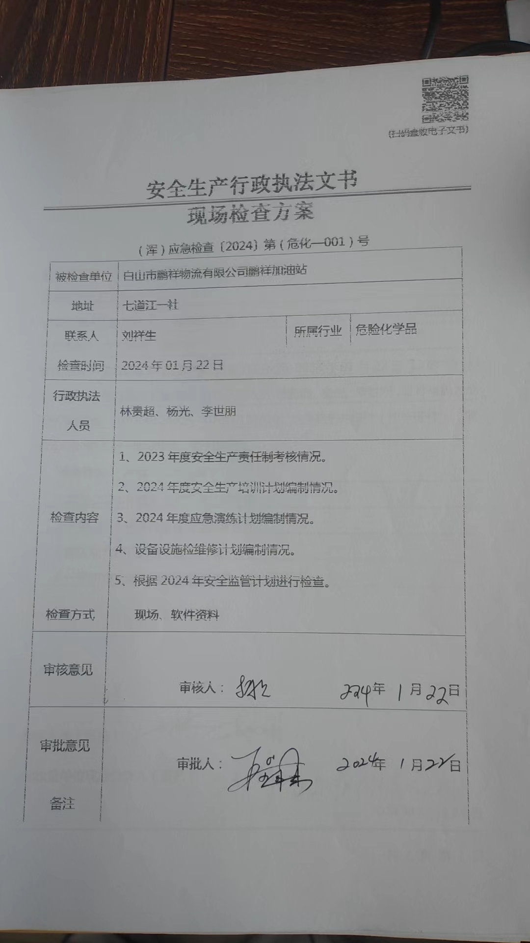 2024年1月22日白山市鹏祥物流有限公司鹏祥加油站检查方案