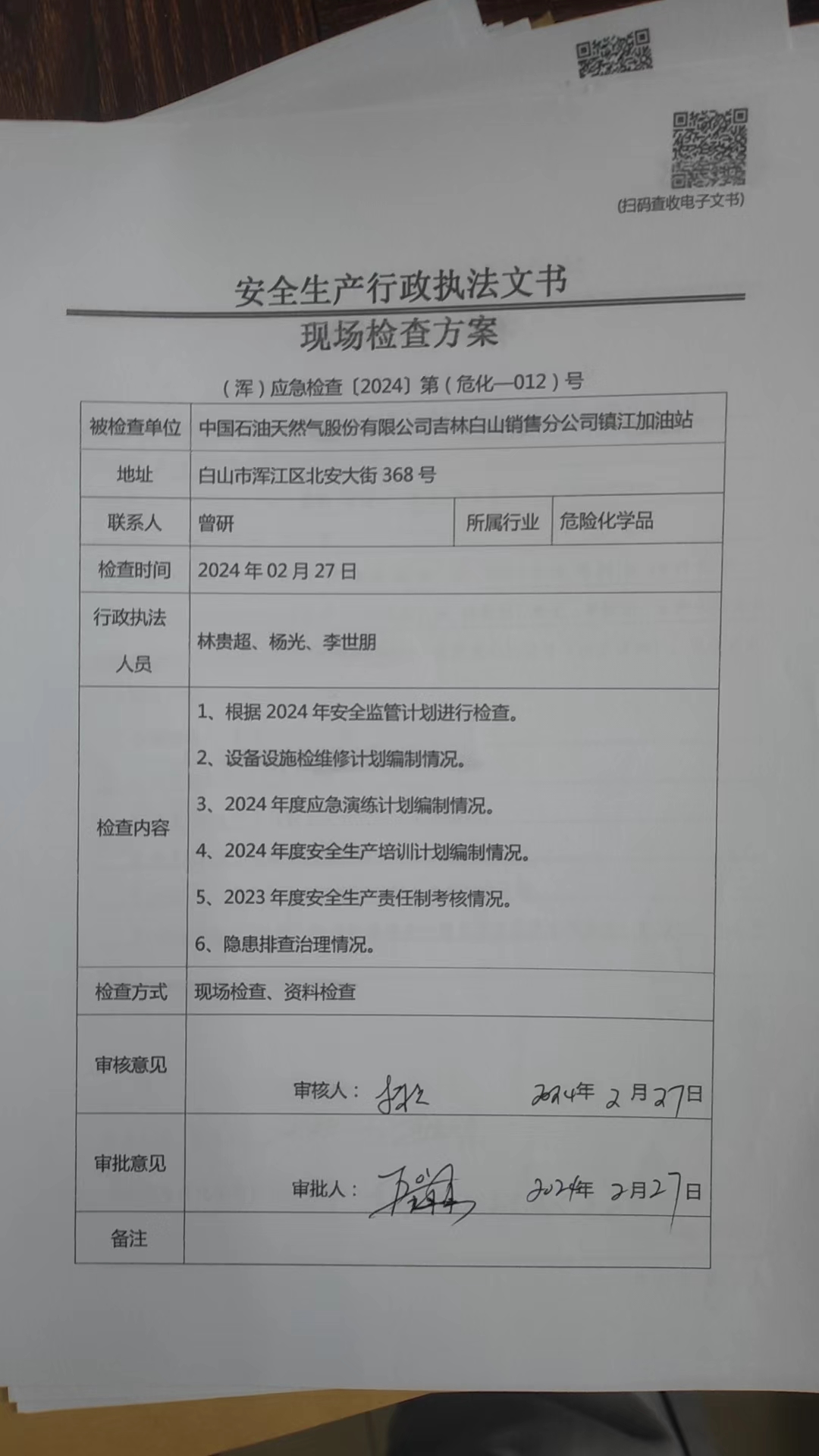 中国石油天然气股份有限公司吉林白山销售分公司镇江加油站检查方案