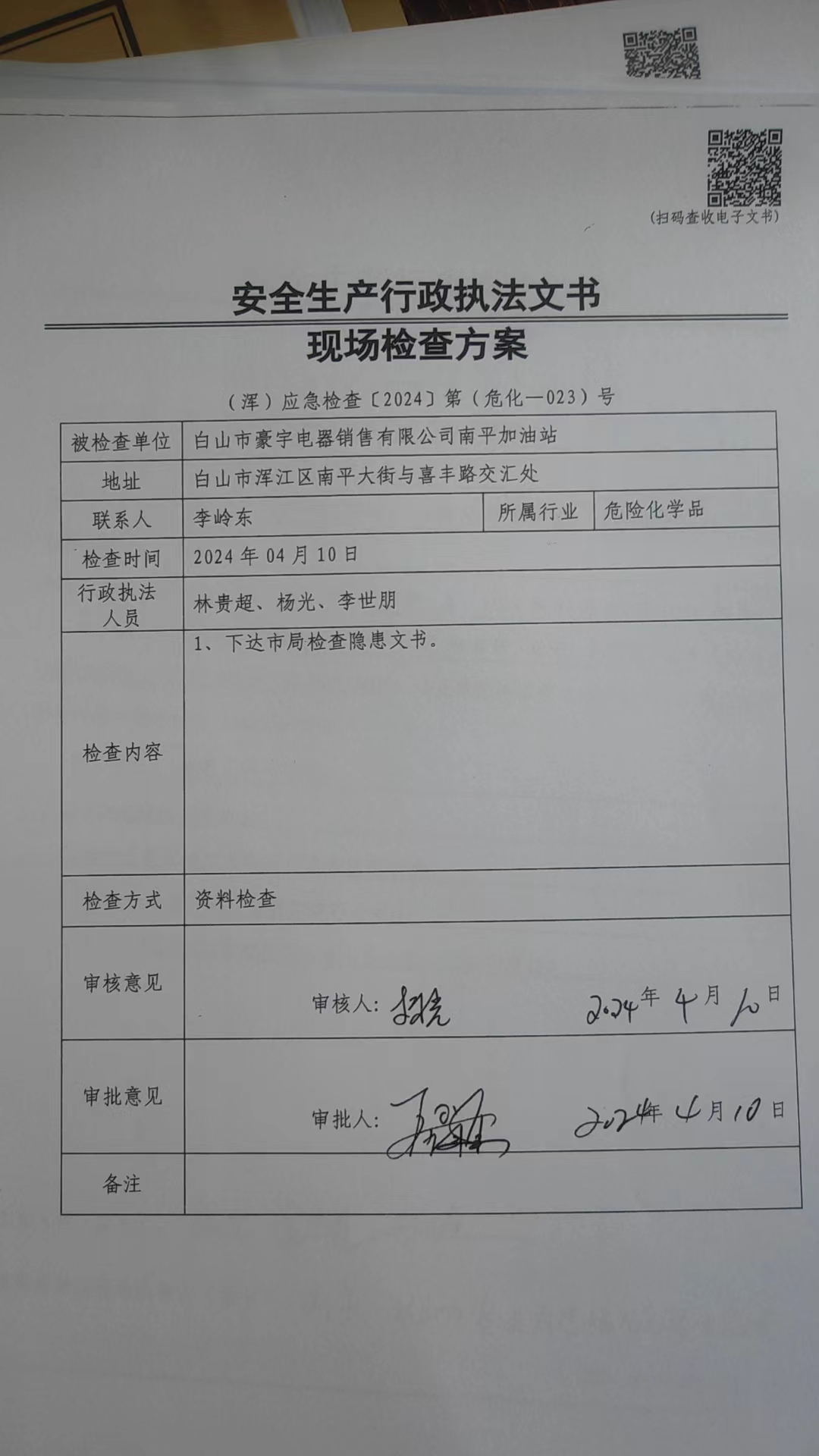 2024年4月10日白山市豪宇电器销售有限公司南平加油站检查方案